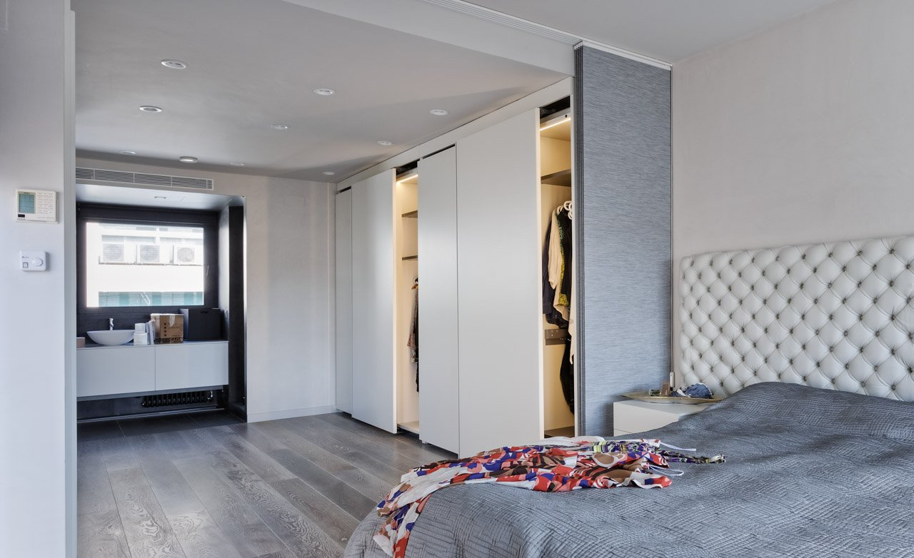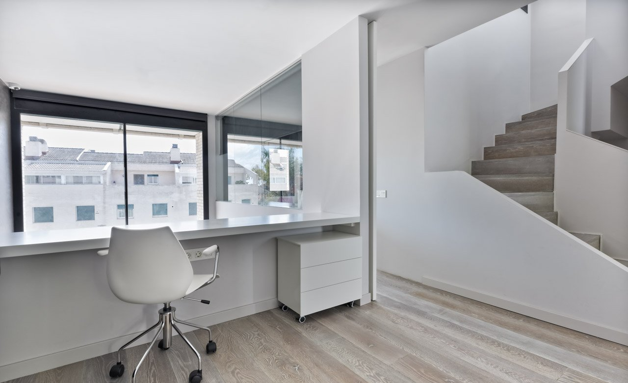 Con la máxima de minimalismo y pureza de las líneas se realizó el diseño del mobiliario de esta vivienda unifamiliar en Esplugues. Nuestra propuesta siempre busca limpieza, orden y calidad: Armarios a medida lacados en color personalizado con puertas con sistema coplanar, muebles de baño totalmente esoeciales para el cliente y creado en madera forrada con Corian, un cabezal tapizado en capitoné hecho exclusivamente para los clientes y la creación de un pavimento técnico para exterior son algunos de los elementos que realizamos para este proyecto.