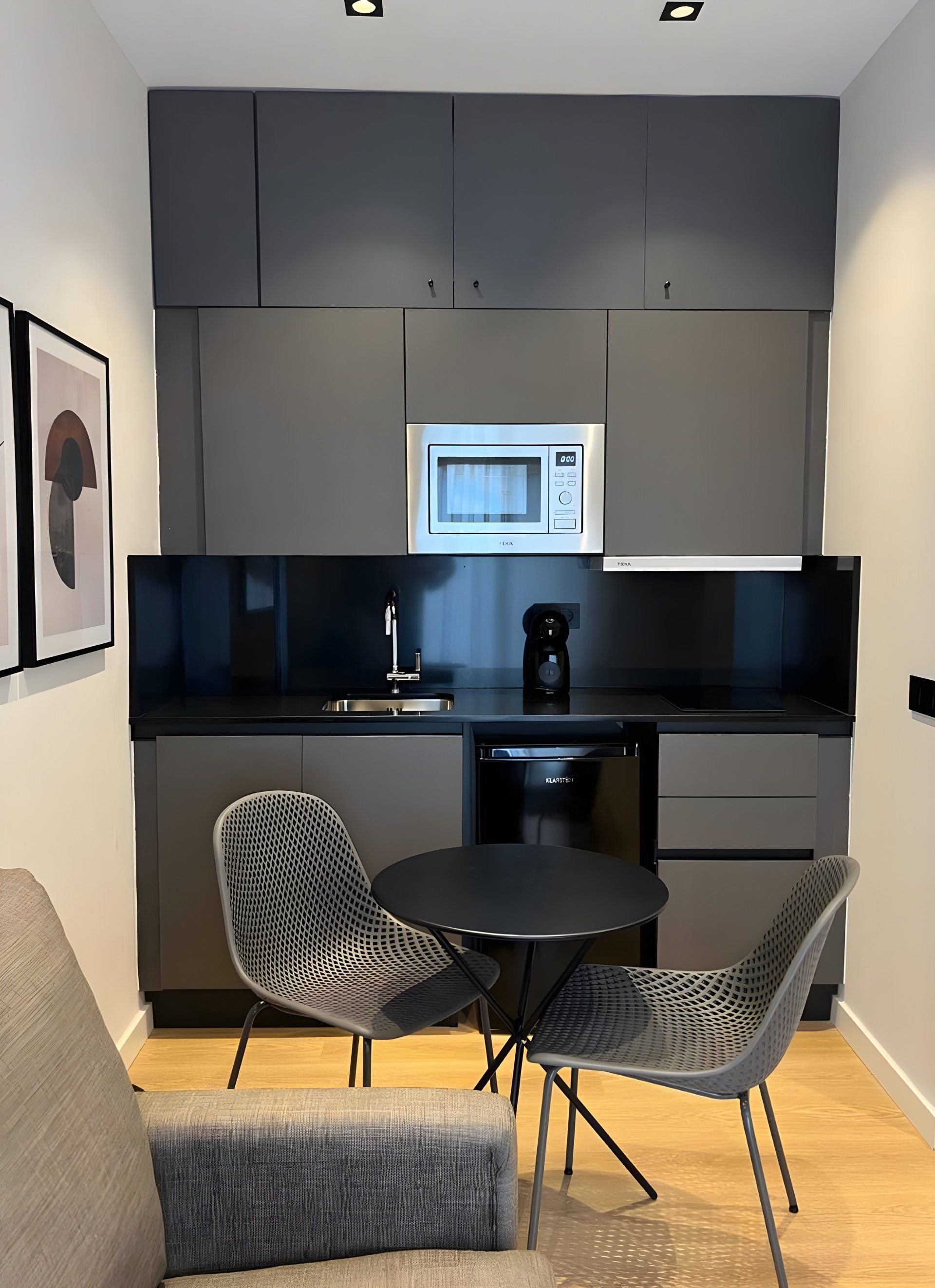 Se utilizan colores y materiales con una estética actual y cosmopolita como la madera de tipo roble, el color negro mate para todos los detalles y una cocina que contrasta con el resto del espacio creando un rincón moderno y acogedor a la vez.